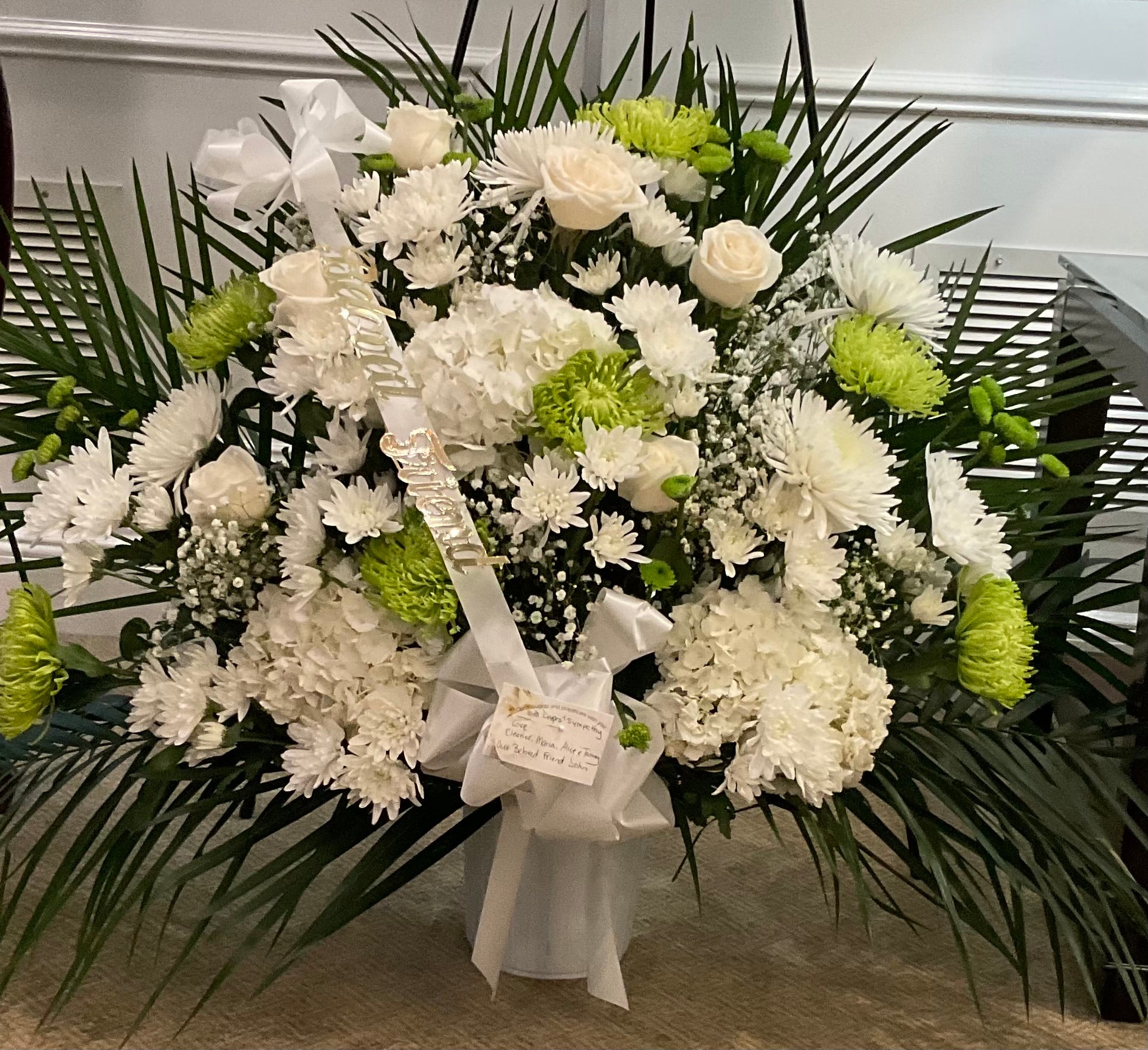 An arrangement of white and green flowers.